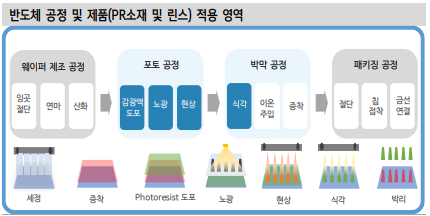 2022년 코스닥에 상장한 반도체 공정 재료 생산 업체다. 주요 제품은 Photo 소재, 포토레지스트 린스, Wet Chemical로 구분된다. 고객사로 는 SK하이닉스, 삼성전자 등이다. 2022년 4 공장 Capa 증설을 진행 중이다. 2022년 제품별 매출 비중은 Photo 소재 45%, Wet Chemical 25%, 포토레지스트 린스 16%, 기타 14%가 전망된다.