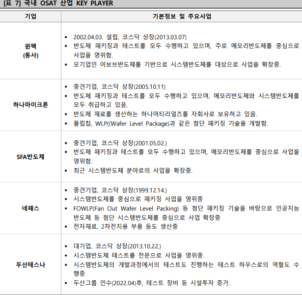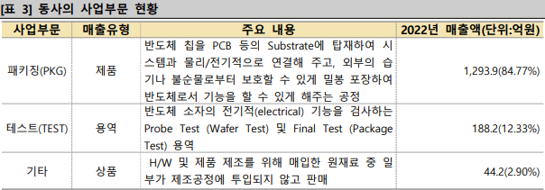 동사는 반도체 후공정인 패키징&테스트를 외주 받아 수행하는 OSAT 기업으로 주력으로는 메모리반도체와 관련된 패키징인 POP, eMMC, 플립칩 등을 생산하고 있고, 최종 매출처인 종합반도체기업이나 팹리스 업체로부터 후공정을 일괄로 수주할 수 있는 기반 인프라를 구축하고 있다.